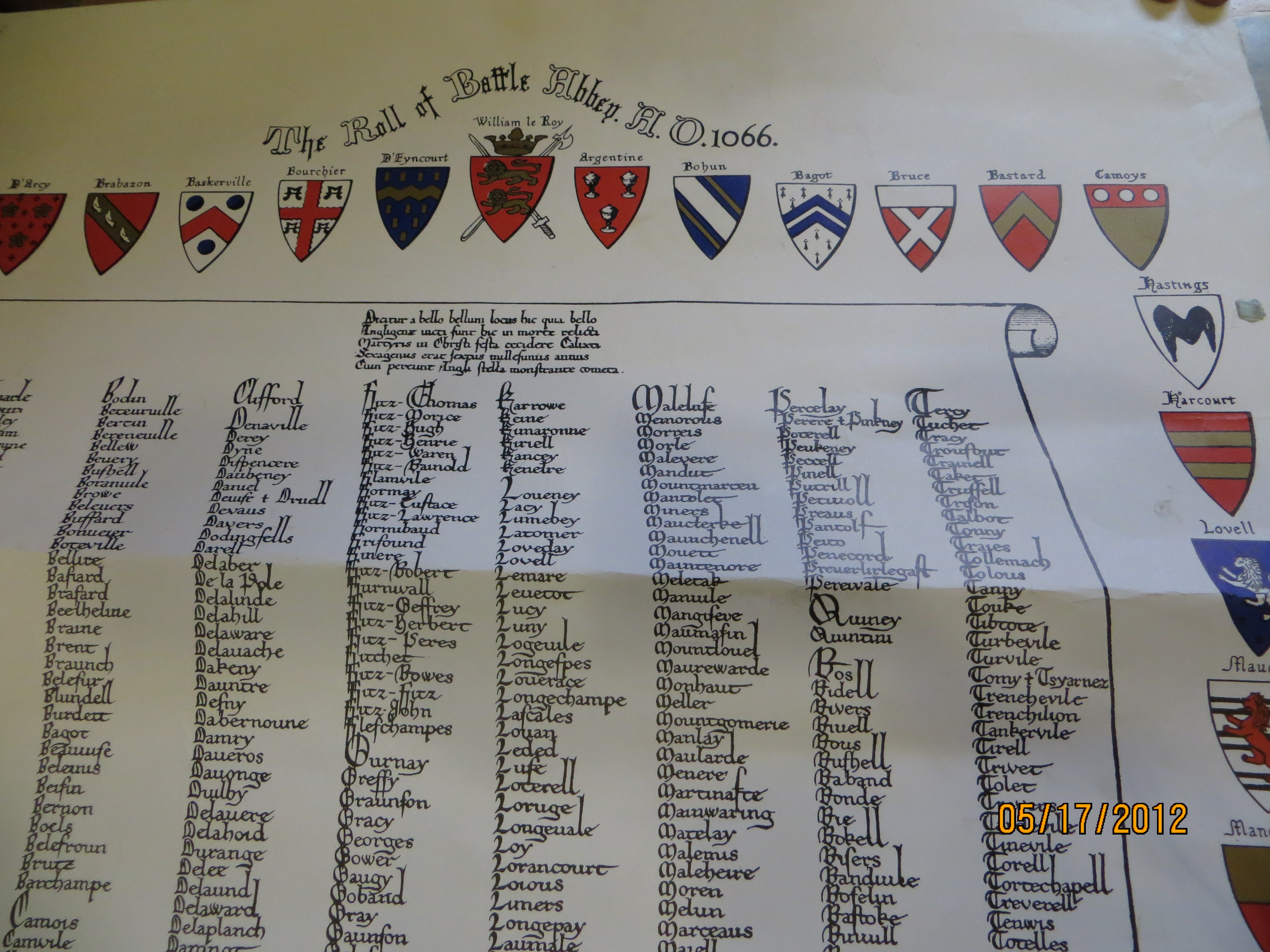 Remember 1066. That was one date your teacher said to remember. It marked the last and only successful French invasion of England. It so happens that Peggy’s ancestor, Ralph Branche was there also.Ralph was a vassel of William de Warrenne. He held in fief from William lands to the north on the Seine estuary in Normandy. William acted as one of Duke William of Normandy’s generals at the Battle of Hastings. It is not known where in the Norman line that Ralph would have fought with his son Richard acting as a squire. We traveled to Hastings to visit the battle site and found Ralph’s name on the battle role of knights.