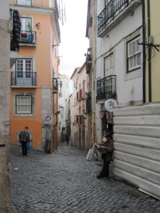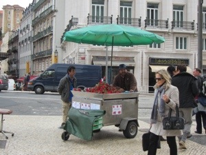 Once in the Baixa, the totally rebuilt part of Lisbon, we were on the flats. People watching and window shopping is the de rigor activity. I love pedestrian only streets. Street vendors selling chestnuts and other stuff abound.