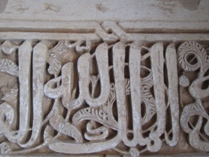 See the cursive W with an ear on the left. That is the Arabic for Allah. It is found some 9000 times in the palace and not messed with by the most Catholic King Ferdinand and Queen Isabella. In fact they were originally buried in another palace in the complex bearing the same words above their grave. They have since been moved downtown with their relatives.