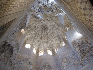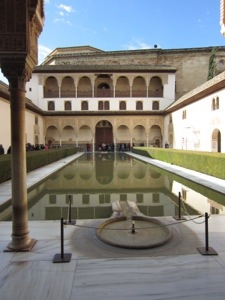 Back to the Alhambra history. The high rocky point overlooking Granada was fortified since Roman times. It had the good fortune of also having lots of water to use for the fortress and the palaces. In the 1300’s most of the Palacios Nazaries, the fancy section with the tough tickets, was built. The walls are covered in tiles and elaborate plaster an wood work.