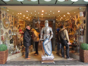 Toledo is famous for its marzipan and its steel. Other than the displays of marzipan monuments, the many venders were under control. The steel merchants sell an amazing assortment of knives, swords, hatchets, suits of armoire, etc. that could only be matched by one city in our experience, Gatlinburg Tennessee. Until our visit to Toledo, I had never seen so many implements of mayhem in one place. Of course in one way Gatlinburg out did Toledo. Only in Gatlinburg can you find t-shirts with Jesus carrying an AR-15 emblazoned with “What Gun Would Jesus Use?”