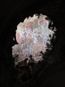 In the 18th Century, they decided to open a hole in the ceiling to let in more light for Mass. The result was extraordinary. I have marveled at Bernini’s Agony of St. Teresa. This almost matches it. Our camera tried but really could not capture much. At least the baby cherub holding up the heavens and the archangel holding the fish were pretty close.
