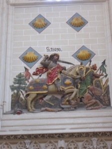Since we are a couple days away from the start of our pilgrimage, it was nice to see St. James in his full Santiago, the Moorslayer pose. Notice the scallop shells.