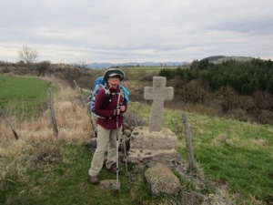 We left le Puy and climbed out of town on a steep road. The weather was cool and overcast. No rain. A little more wind than we would like. Almost perfect hiking weather. Started seeing pilgrim monuments almost immediately. Peggy did not get pictures of them all. To say that this path has been here a long time is a bit of an understatement. The stone walls are ancient to match the numerous crosses. The trail is clearly marked and easy to follow.