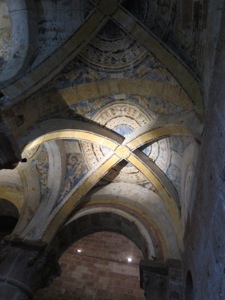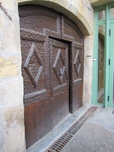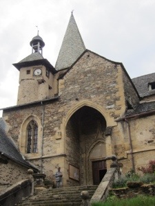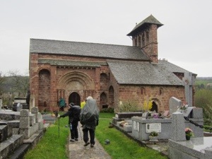 We were advised at the Convent to avoid a section of the trail that is treacherous in rainy conditions. We followed the nun wisdom and arrived safely in Espalion around 10 after we had visited the Eglise de Perse dedicated to this saint who walks around holding his head in his hands. I believe It was St. Roch. Almost a perfect example of Romanesque style. The tympanum gave the standard warnings to those who are naughty.