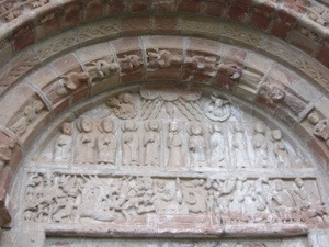 Lovely little town! Pure magic. Love the photo of the river with the cherry trees (?) reflecting in the water.So interesting to see the Romanesque tympanum. Very primitive iconography, but effective.