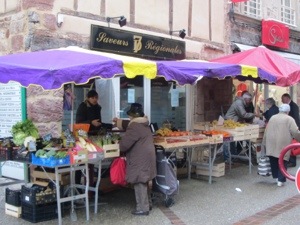 In the town Espalion it was market day. Lots of serious shoppers. Created a bit of a challenge navigating with backpacks through the shoppers lined up to buy their fresh oysters and whatever. Peggy got us apples and I got a couple sandwiches at the local boulangerie.