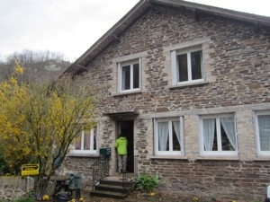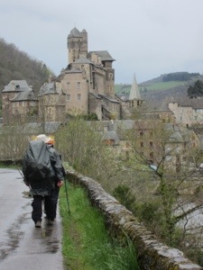 The funky little English guidebook came in handy. It advised us to stick to the little road rather than following the GR 65 in wet weather. It was a couple of kilometers longer but would not be slippery like the trail. Our compatriots, Marie and Richard, were skeptical since that advice was not in their French guide. We arrived in Estaing some two hours before people who left this morning with us. The poor French ladies were covered in mud from slipping and falling in the slime.