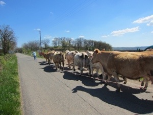Interesting sights today included a French cattle drive on our little road, and an 11th Century depiction of Adam And Eve and the snake. Also saw that we missed our chance at a Tete fe Veau (veal head) and tripe feed in Livenhac. Maybe next time. Also saw our first of the strange round buildings with stone roofs. Did see a hobbit door.