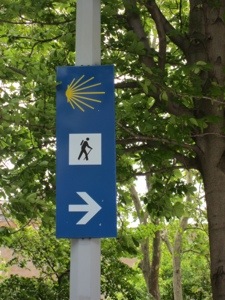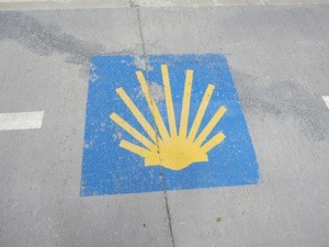 We were told to just follow the trail markings. The folks in Pamploma have outdone themselves. There are signs on the light posts, painted symbols on the sidewalk and really cool stainless steel shells all the way for some 9 Kms. It was a noble effort.