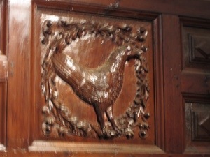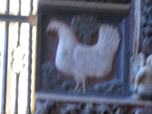 On with the story. In the 14th Century, a German pilgrim family entered this town on their way to Santiago. The young son rejected the advances of a local hussy at the inn where the family was staying. The wanton woman then planted a silver chalice in his baggage and ratted him out. He was then hung, as was the custom, on the local gallows. A month later, the parents returned from Santiago (Note: It would take us two months to do the same) and found their son still in the gallows and cheerfully alive. He told his parents to find the mayor to let him down since Santo Domingo had brought him back to life. When the mayor heard the parents out, he told them their son was as alive as the two roasted chickens that he was going to eat. Suddenly dinner grew feathers and other necessary chicken things and started to crow. Needless to say the mayor pardoned the boy. I don’t know what he did with those chickens, but chickens have been housed in a pen in the church ever since.