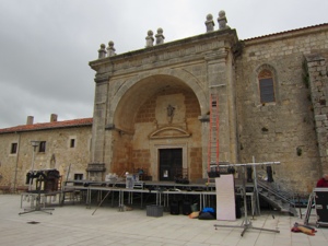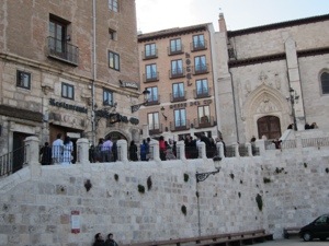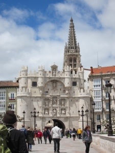 New pilgrim contact from Sacramento State, a Professor of Ethnic Studies. Enjoyable conversation as we trudged through crosswalks and around cars parked on the sidewalks. He has many similar interests. We will remain in contact. Kept following signs to city center and then to the cathedral where our hotel was located. Unlike most ad copy, they were not kidding when they said next to the cathedral. The Hotel Meson del Cid is right on the cathedral square. We got to watch a very large wedding and it looks like they have booked most of our hotel. They have been celebrating all afternoon and seem to be must getting started. Haven’t been invited to the party. It may come to us.