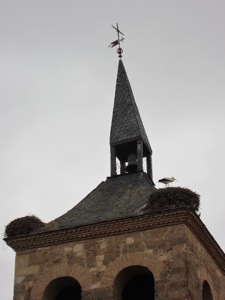 Storks like Spain. Their stork babies can’t even stand for two months. Mom or Dad are on watch and feeding their brood. We have a nest in the bell tower of St. Martin which is outside our hotel window. The tower is of stone. Storks like stone. Peggy keeps her eyes open for the baby storks.