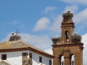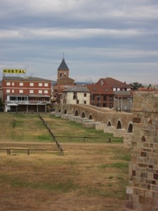 After breaking 300 lances during the tournament, Don Sueno announced that his honor had been restored. He removed the iron collar and announced his pilgrimage to Santiago. This is the story of the bridge we walked over and under and around today. The lists and viewing stands were empty for we are too early for the reenactment. You still get the feeling given the setting. Nice place for a beer. There was a bell tower with a plethora of storks.