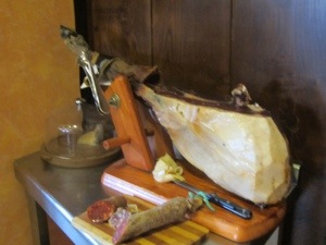 This is our first Galician village. As such we were pleasantly surprised by the number of restored homes of the Celtic design. They are similar to those built all over Brittany and the British Isles. They are build of stone in an oval pattern. The roofs are thatch with no chimneys since the smoke eventually escapes through the thatch. We experienced that last summer in Ireland and Scotland. No wonder they immigrated. But the smoke was great for curing ham. Peggy got a good picture of ham on a hoof.