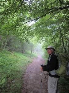 Anyway, back to the beginning of the day. We woke to no rain and had a quick breakfast in O Cebreiro before hitting the Camino. The sky’s were overcast and suddenly turned foggy, much like San Francisco. Reached the statue of the pilgrim leaning into the wind and took a picture like everyone else. It was crowded for a moment. Walked on into the sun and stopped around 6 Kms out at a bar serving cafe. No Limon as it was cold. Joined by a crowd of 20 or so Russians from Moscow. It was crowded in the bar served by one gal.