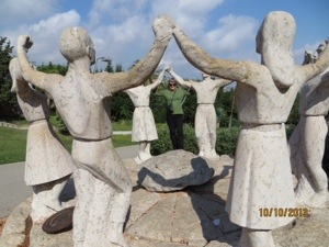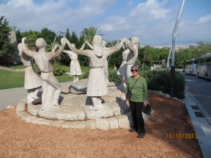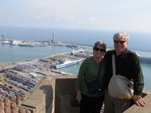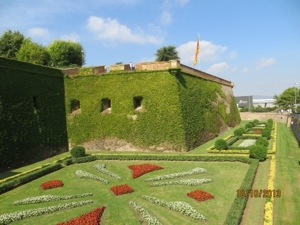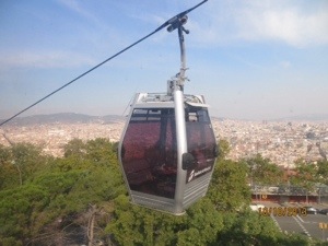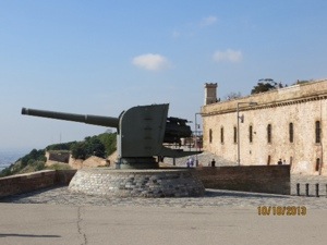 After our hike to the park and our return to the Metro, we headed for Montjuic ( the mountain of the Jews) that overlooks the harbor and the city center. The journey involved a Metro ride, a trip on the Funicular and then a glass gondola. Peggy was happy. At the top is a 17th Century fortification with plenty of modern naval guns to protect the harbor. Great views and photo ops. We decided to walk down between the tour bus gauntlet. Not too bad taking the side trails. The dancing figure sculpture presented some cropping issues to avoid the buses from inclusion.