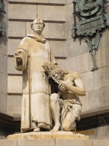 We concluded our visit to town with a return to the market for Helado (gelati) and wine shopping. Much better than the overpriced and generally mediocre cruise ship offerings. Always fun to hear the clank of bottles going through security screening. Said goodbye to Columbus at the harbor entrance. Notice the Indian thanking the priest for salvation.