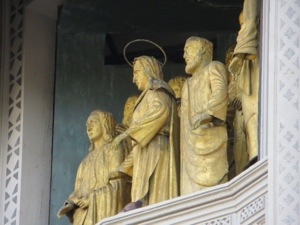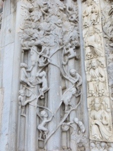 We did enjoy the overlooked reliefs on the front of the cathedral. Many celebrate the grape harvest and the production of the local vintages. I would rather focus on these evenMost of the historic part of Messina dates from the Baroque era. This was the Golden Age of Spain and Sicily was comfortably Catholic being far removed from the trouble makers like the Dutch. Our many Dutch fellow travelers had to look in vain for their favorite herring to swallow whole while in Messina. In fact, we saw saw few venues stocked with fish or other goodies. Most of the downtown is dominated by shops selling shoes and nice clothes. Italians display their social standing in the clothing and shoes. We poor Americans by contrast celebrate our democratically elected t-shirts and sneakers.