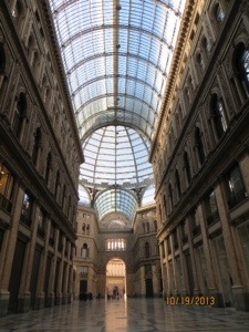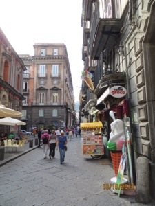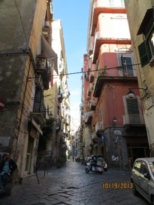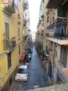 Naples is a crusty carbuncle of a city. Founded by the Greeks circa 800 BC, the city streets have seen rulers from everywhere. The most complete redo of the Neapolitan environment was accomplished by the Spanish Bourbons and their Baroque tastes. The curlycue facades are everywhere. They seem to be piled on top of previous structures along the impossibly narrow streets and alleys. The sun must only appear at noon on many of these places. Nonetheless, the streets are festooned with laundry. Dryers must not have made it here. The Piazzas are the only sunny spots that collect crowds without effort although there are plenty of people on the streets. Open space does not exist in this ancient urbanity.