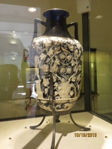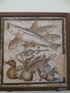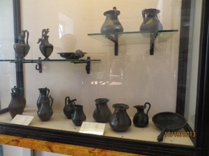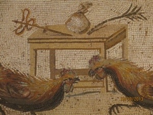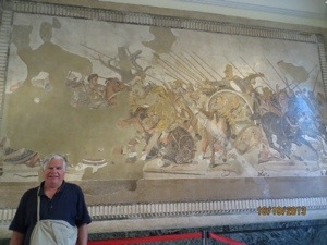 The mosaics can only be appreciated at close examination. The tesserae or small pieces of rock from which the mosaics are constructed are minute. They are usually smaller than 1 mm on a side. Do the math. I think it works out to a million pieces of rock for a square meter of mosaics. The famous mosaic depicting a brave Alexander taking out a wimpy Darius at Gaugemela must be 40 meters square. It was one of a number of works in one villa. Peggy took plenty of pictures. OK, the mosaics were great but that did not answer my big question about the Romans. The solution had to be found up one more flight of stairs.