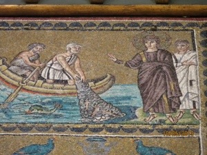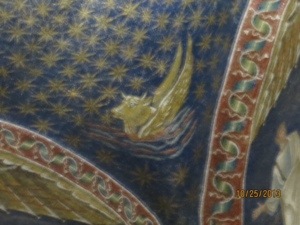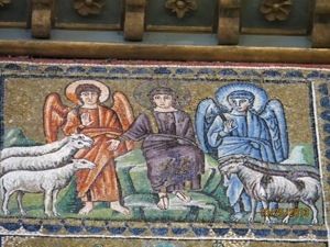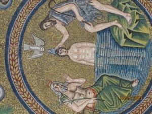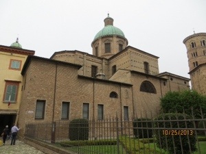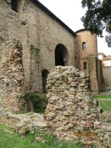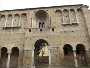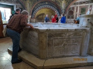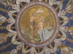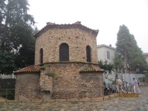 Another early church was the Duomo or cathedral of Ravenna. All that remains of the original structure is the chapel an early archbishop and they would not let us take pictures. Trust me, it was thoroughly Arian. Next to the cathedral was another early Baptistry with cheerful dancing Apostles on the wall overlooking the large marble baptismal pool. This pond was designed for more than one at a time and Jesus is looking down from above showing how it is done.