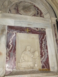 A later church was built by the Franciscans over an earlier fifth century church. The alter is built over the sunken crypt. The water table has risen. The crypt has mosaics and a couple feet of water covering them and plenty of gold fish swimming around. I am not making this up. Near the Franciscan church lies the actual burial place of Dante. He was exiled from Florence and caught malaria and died in Ravenna. The Ravenni were sure that the powerful Florentines would snatch his famous remains so they hid him for three centuries in the Franciscan church. People forgot where he was buried and did not relocate him until the mid-19th Century. He now has a final resting place.
