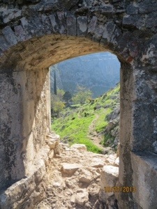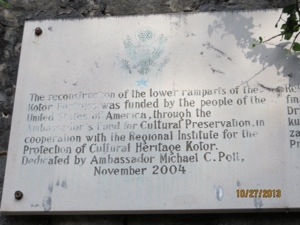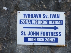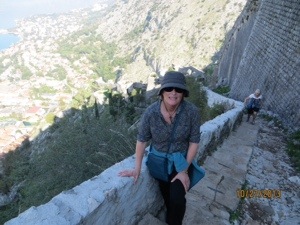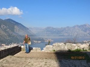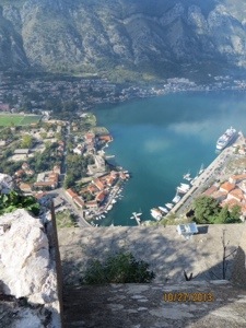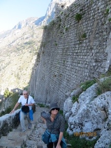 We managed to make it to top. The pictures say it all. Incredible. Good commentary with our fellow tourists. We headed back down after catching our breath and exploring the WWI improvements made by the Austrians who used Kotor as their command center for their navy. I wonder if Captain Von Trapp liked the place as much as we did? Bought some cold water from a little old lady about 2/3rds of the way up. She invited us to visit her home on the side of the mountain. You reached it by crawling through a hole in the fortifications. It was there some thousand feet or so above the bay. She is one of those people who will reach 150 years by carrying bottles of tourist water up the mountain.