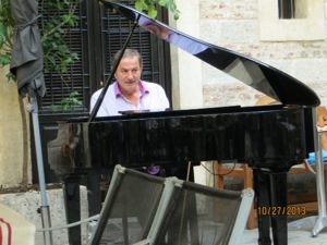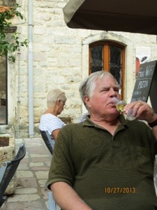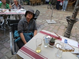 Wandered back into town and I was ready for a beer. We sat down at a table and were soon joined by many other hikers. It was made more welcoming by a pianist playing standards. The beer was cold and reasonable. They served wood fired pizza and I felt at home. I talked to owner who looked the part of a Resistance fighter. I saw a gallon glass jug with brandy looking contents. He offered a glass. Never hurts to say yes. It was homemade, “very old” plum brandy and actually good. Even better, it was a gift. It never hurts to show appreciation for local efforts.