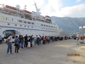 Welcome to Montenegro on the Eastern Adriatic Coast. This place has been around almost forever but an independent country since only 2006. The city of Kotor is on a bay at the end of the largest fjord in Southern Europe. Technically it is not a fjord carved by a glacier but a sunken river valley. You could not tell me the difference as we are sitting on the boat looking up a couple thousand feet to the top of the cloud enveloped mountains that surround the bay. We spent a delightful day here.