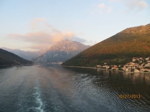 On deck for the “sail away”. Since it was foggy this morning we never saw the way we came into port. As we left port we were overwhelmed by the beauty of the surroundings. It was great. Went by the little island with a church that the locals each bring a rock to each year. It gets a little bit bigger each year. We finally made it through the 400 yard wide exit to the bay. It seemed that we might hit the sides. You leave the this hidden bay that could have been the home of the “Mouse that Roared” or “The Prisoner of Zenda”. Amazing that it is not a Disney set and packed with tourists. Maybe it is hard to believe that it exists.