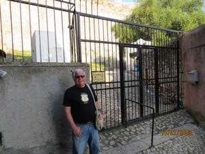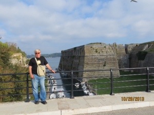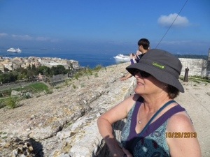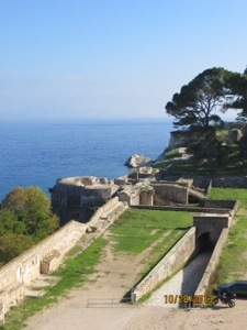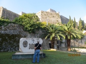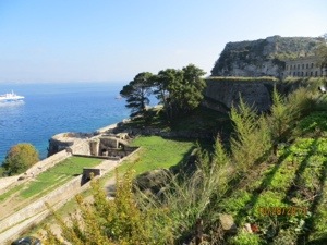 After leaving the church, we dove into tourist shopping. Local alcoholic concoctions are heavily marketed. In addition to that old standby lemoncello, the Corfuians produce a qumquat brandy. After a sample I concluded that it is not my favorite. Very close in taste to something like Luden’s Cough Medicine except sweeter. Looked at the sponges and evil eyes and decided that we could live without them. Headed to the “old fortress” through the trinket gauntlet. As in a fairy tale, the fortress was not only open but because of the holiday they were not collecting an entrance fee. A miracle.