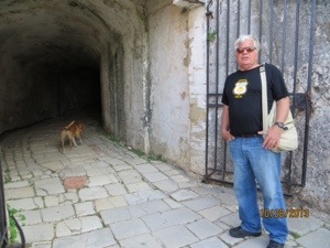 You get into the place by crossing a moat that today is filled with fishing boats and some interesting shacks. The moat was a project of those industrious Venetians who ran this place for some four centuries. In their efforts to maintain the Adriatic as their pond, they made sure the place was protected from the aggressive Ottomans. The Venice lion is everywhere on the walls of these stone bastions. We stopped for a caffe latte and an Americano for me. Did the daily upload chore and since there were stairs to climb we started up. One of local dogs joined us. We should have brought treats but then we would have to bring him home. The lighthouse at the top was built near the remains of British and Venetian barracks. The Nazis destroyed the old ambassadors residence as they departed this part of Greece. One less old building to explore. I wonder if a place like this was the inspiration for the Guns of Navarone.