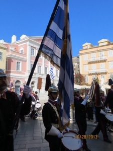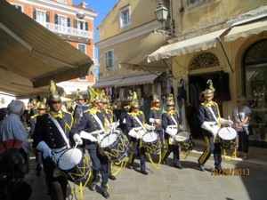 Back across the moat and we could hear the sound of drums. Plenty of police in dress uniforms. Now we knew it was a real holiday.the first song the marching band played was British Grenadier. The mystery deepened as no one seem to know the reason for the holiday. We dodged bands on our way back to the local bus for our return. The square near the bus stop was filled with another band and riot police with cool plastic shields. Something was getting lost in translation. An older tourist thought it was a saints day. A younger guy said the date celebrated the Greek decision to turn down Mussolini’s offer for the Greeks to become Italians. We left as dignitaries were emerging from the crowd. Given Greek politics, I can come up with a number of possible reasons for the police presence. Nothing happened before we left the area. No harm, no foul.