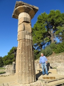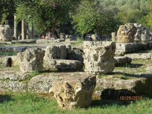 Paid our entry fee and walked past the hill where Zeus avoided being a snack for his dad, Chronos. Suddenly it was not difficult to imagine being there over 2.000 years ago. You walk through the Altis, or sacred olive grove next to the Gymnasium where the athletes trained in preparation for the games that were held every four years. The area is surrounded by stoa and across from the Prytaneion which held the sacred flame that was never extinguished. It was not burning today as it has been out since the mid-5th Century when it was put out by the Christian Emperor Theodosis. Guess it was necessary as the Zeus altar was thought to be close by where animals were sacrificed at the beginning of the games.