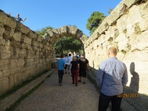 Evidently the Olympics have always had challenges with athlete behavior. Leading to the stadium entrance are sixteen statue bases for bronze statues of Zeus paid for by fines on cheaters. Evidently it was common practice to try blood doping by drinking bull blood before competition – Red Bull? Their blood was tested by official urine tasters. Yuck. Their names and families names are inscribed under the statues. Could not read the names. How many would they need today?