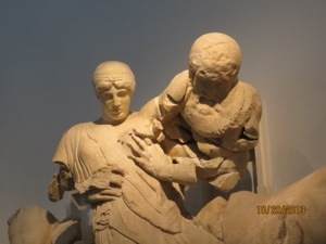By this time we were joined by almost countless tour groups. Fortunately the site is large enough to absorb the crowds without destroying the experience. The circular temple near Zeus was built by Phillip of Macedonia to commemorate his victory over the Greek confederation. Somewhat strange to have an in your face building by Alexander’s dad. But then the London Olympics did not hide Nelson’s statue on Trafalger Square. You then walk past the oldest temple on the site dedicated to Zeus’ much ignored wife Hera. The Doric columns where still impressive. We then saw the rather unimpressive stones where the modern Olympic torch is ignited every two years. The fountains and statue bases for Roman notables were empty as were the treasury buildings where cult assets were housed.