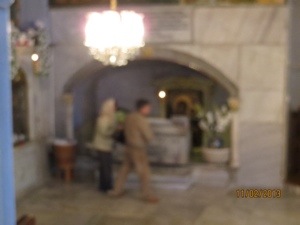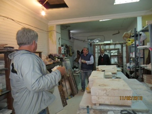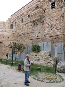 We walked along the old wall at ground level. We walked by the restoration efforts on the last Byzantine Palace. Through an opening we spotted a bird show. Pigeons were being offered for sale and consumption. They were on the wing as well as were the bags of stuff to feed them. No tourists in sight. Continued to the Holy Spring of Mary that is surrounded by very loud Mosques. We did not help ourselves to the Holy Water but we bought a small ornament. Around the corner was a small shop with ceramic crafts. The artisan was there, Ishmael was his name. He spoke English well and we had quite a discussion about families and the history of Istanbul. We purchased some charming reproductions that are light enough to bring home and place in the wine cellar. Enough said for now.i am holding his prize 3000 year old pot that Peggy almost made me drop.