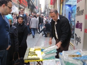 Headed into the Spice Market which today sells lots of tourist stuff. But surrounding the market itself are the stores and vendors selling to everyday Turks. Everyone seemed to carrying bags of purchases. This makes for plenty of bumps given the crowds. We managed to get used to it. Our money is safely tucked away in the meantime. Actually bought a few things. Did not buy the grape leaf roller and stuffer gizmo although we were tempted. We also did not buy Happy Cat brand food or any of the medicinal leeches in the 5 gallon jugs. They would have made great presents.