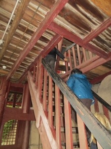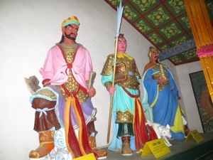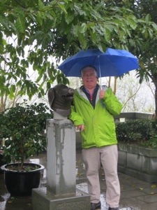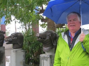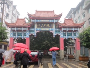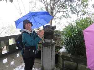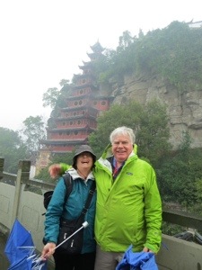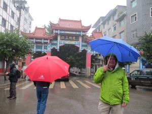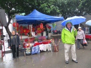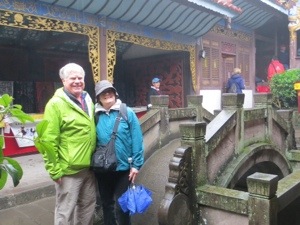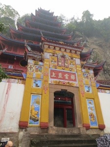 Our group thinned out a little because of the rain. Not too bad actually. We wound our way through the trinket and souvenir stands that line the way to the Pagoda. We needed to cross a suspension bridge over part of the Yangtze. It bounced a bit. We then climbed the 100 stairs inside the pagoda to the temple on top. The scary statues looked like some of my neighbors. The place lacked any sense of spirituality. I guess it is tough with tourists and no Monks.
