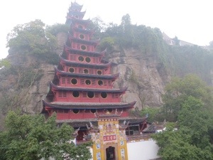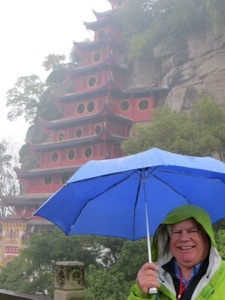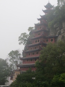 It had to happen. Rain is upon us. We are docked at Shibaozhai. We are around 200 kilometers below our Chungking destination. The town tourism centers on a Ming Dynasty pagoda that was built to provide an easier access to a Buddhist temple on top of a rock in the middle of the Yangtze. A village once surrounded the temple. Today a concrete coffer dam replaces the village whose villagers have been relocated to higher ground.