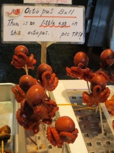 Peggy found some more silk that needed a home in California. I found squid on a stick. It was actually quite good. I passed on the octopus on a stick because they stuffed its little head with a quail egg. I like quail and the combination was more than I could handle. We did find the Sake samples. Actually there were more tastings here than at Costco. You just had to be ready for almost anything.