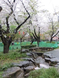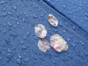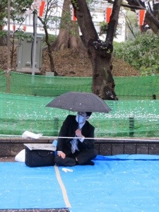 It is also raining cats and dogs. Tarps on the ground are allowed but not easy ups or tents which would block views of the blossoms raining down. The Hanami advance teams patiently endure the downpour. It is quite insane to a Westerner. But then spending a week in a tent in front of a store waiting to buy a toy is also nuts.