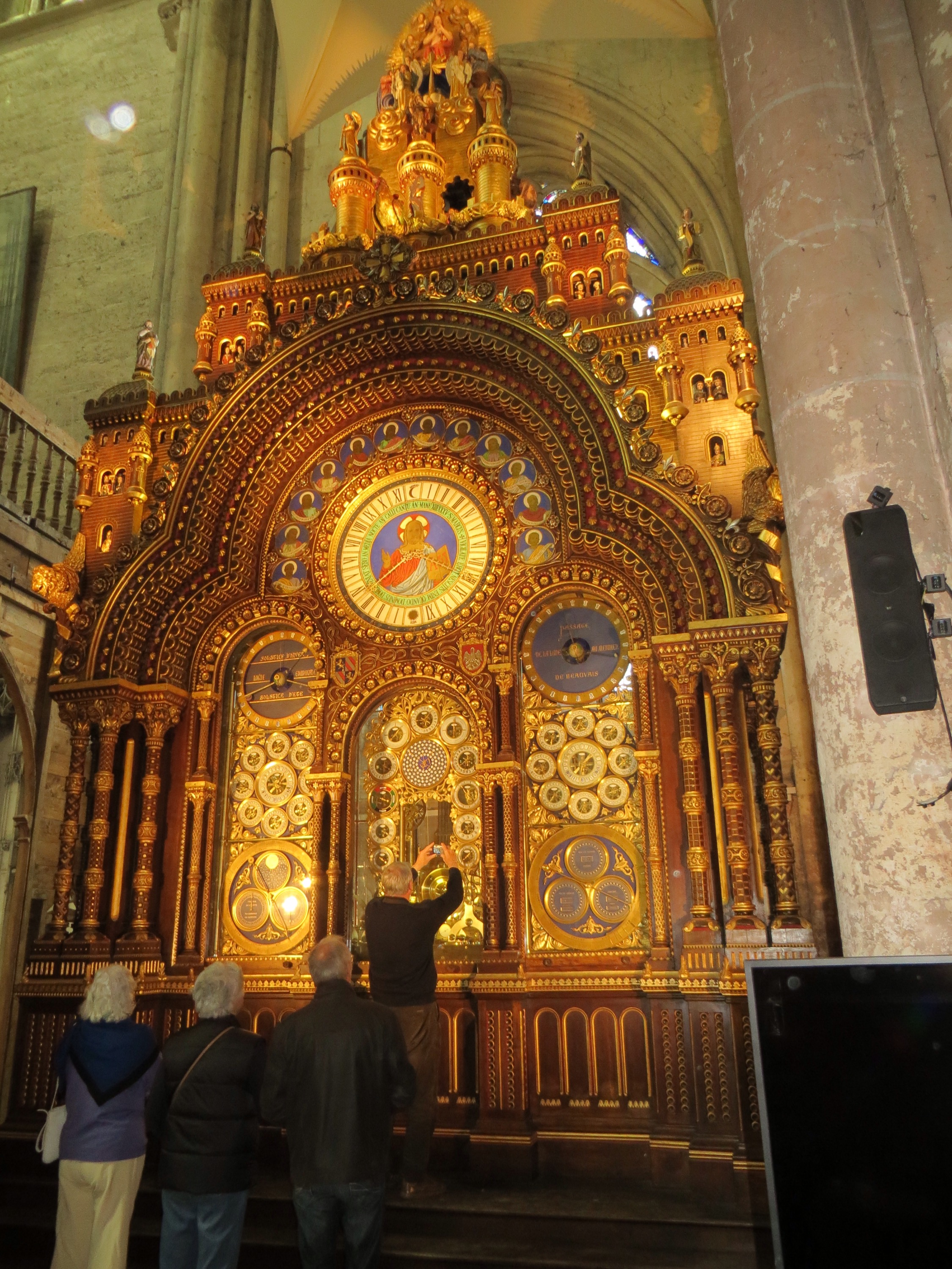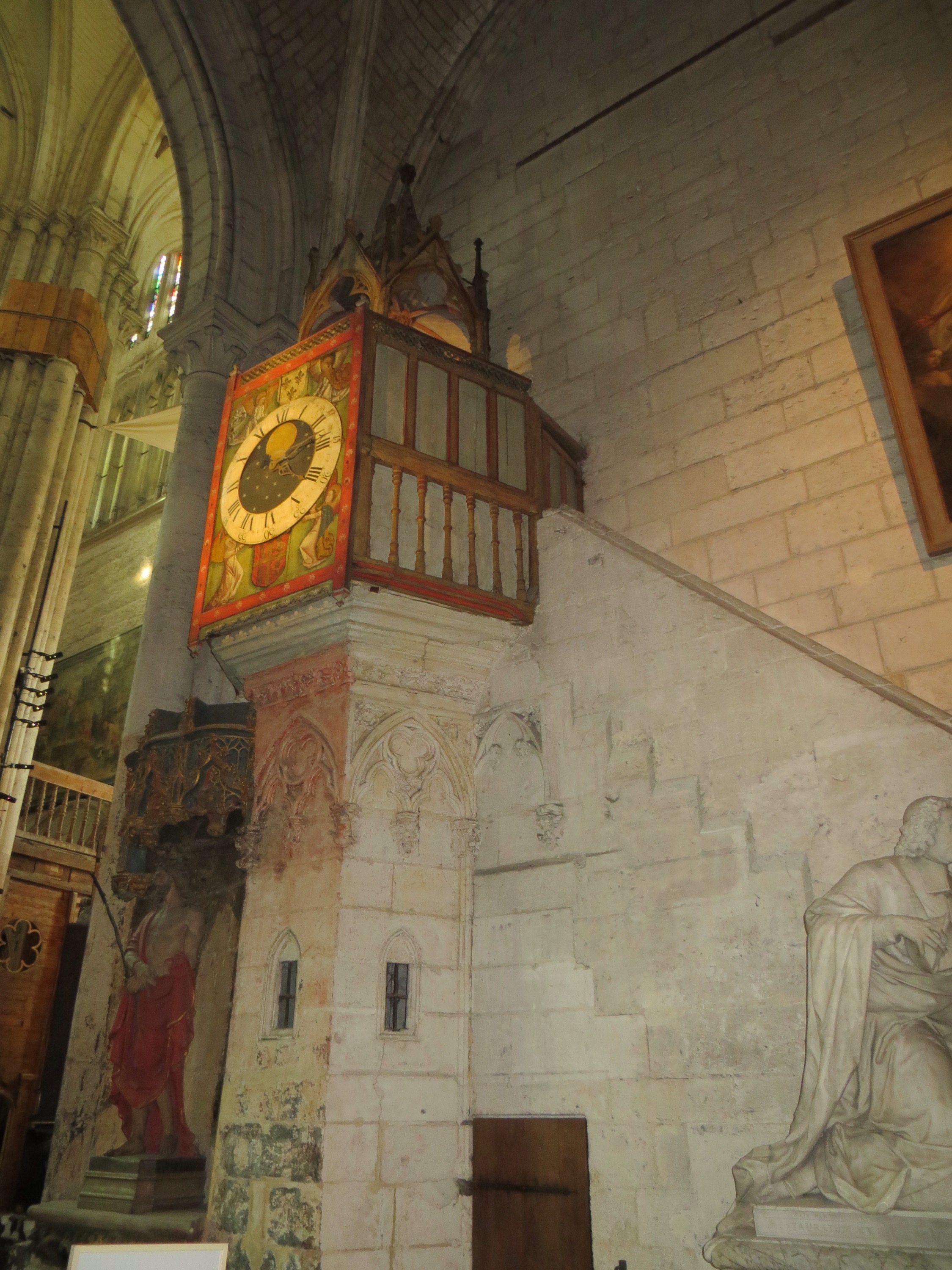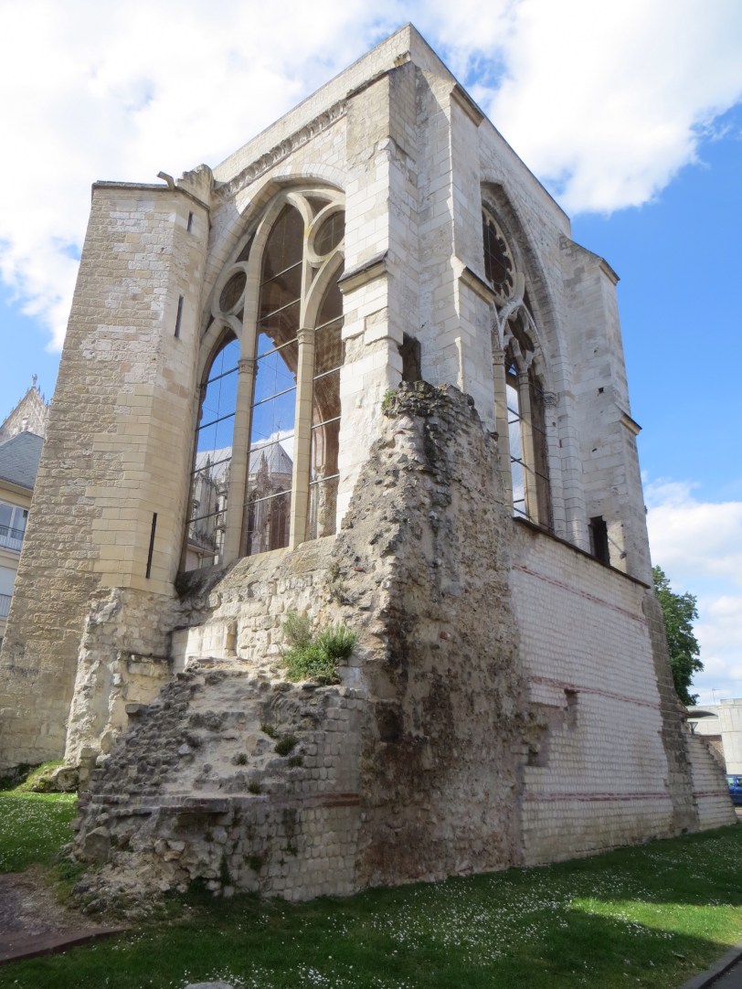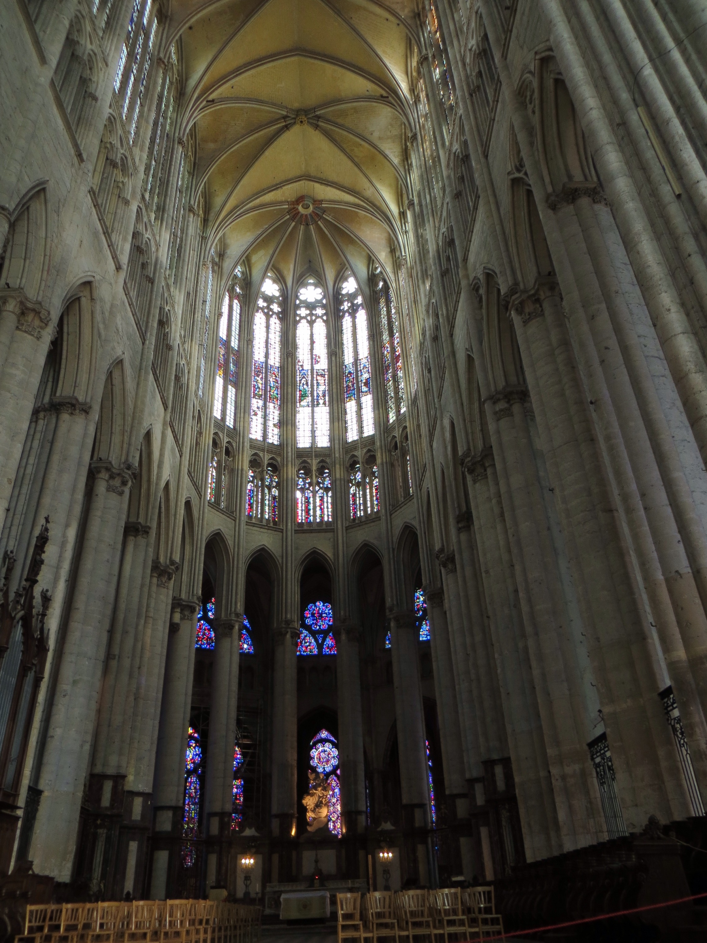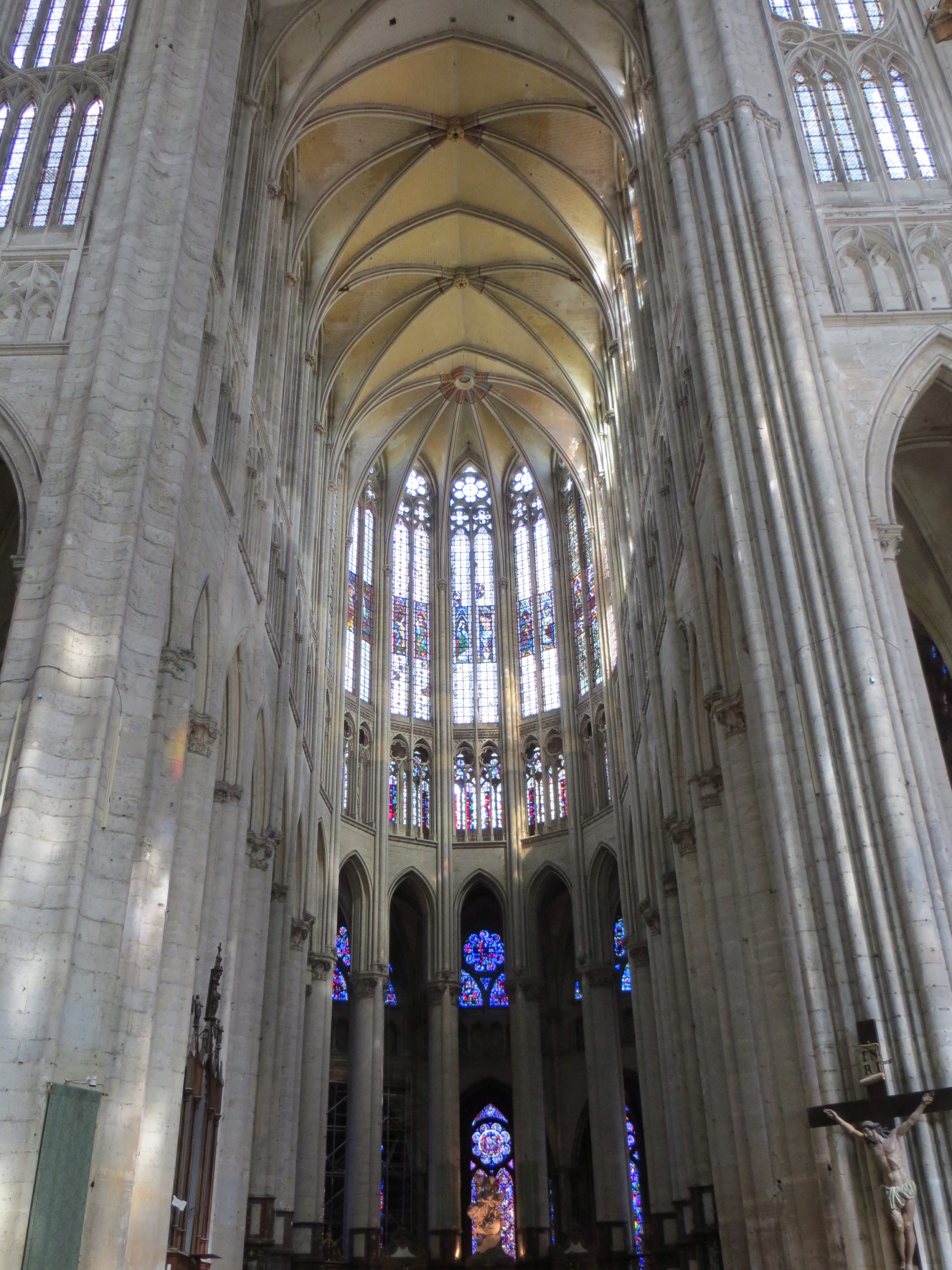 Beauvais Cathedral was built in front of an earlier Romanesque basilica. The work on the Gothic construction began in 1225. That it still stands is remarkable. Shortly after the construction started, the Bishop decided to outdo the neighboring dioceses. He ordered that the choir vaulting reach 157 feet or ten feet higher than neighboring Amiens at 148 feet. Things went well until the new choir collapsed in 1284. That section was redone but work never started on the nave. You have a choir and the transept portion of the church without a nave. The old Romanesque basilica built in the Carolingian style serves as the “nave” today. There was a service going on so we didn’t venture in. The entire Gothic portion of the cathedral just hangs in there. Over the centuries various forms of reinforcement have been added such as more buttressing and tie rods between the flying buttresses. The wooden braces inside the cathedral add to the jerry rigged appearance. It needed to stand one more day while we were there. Mission accomplished