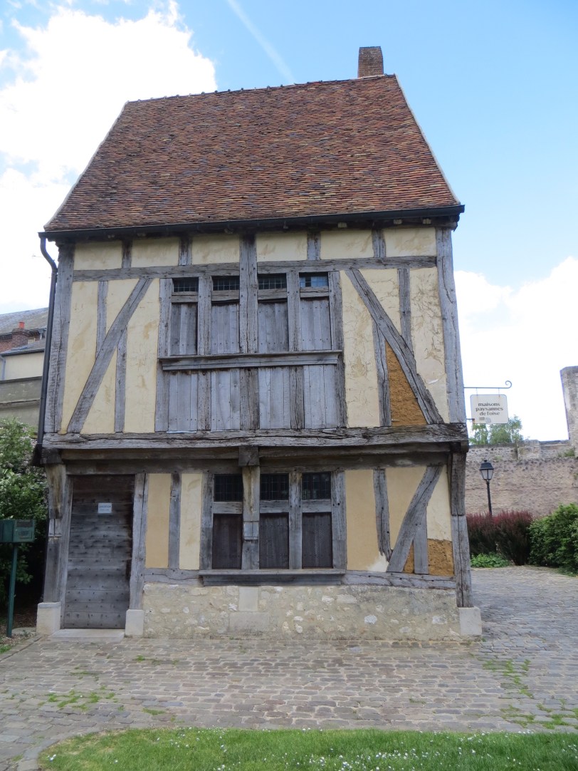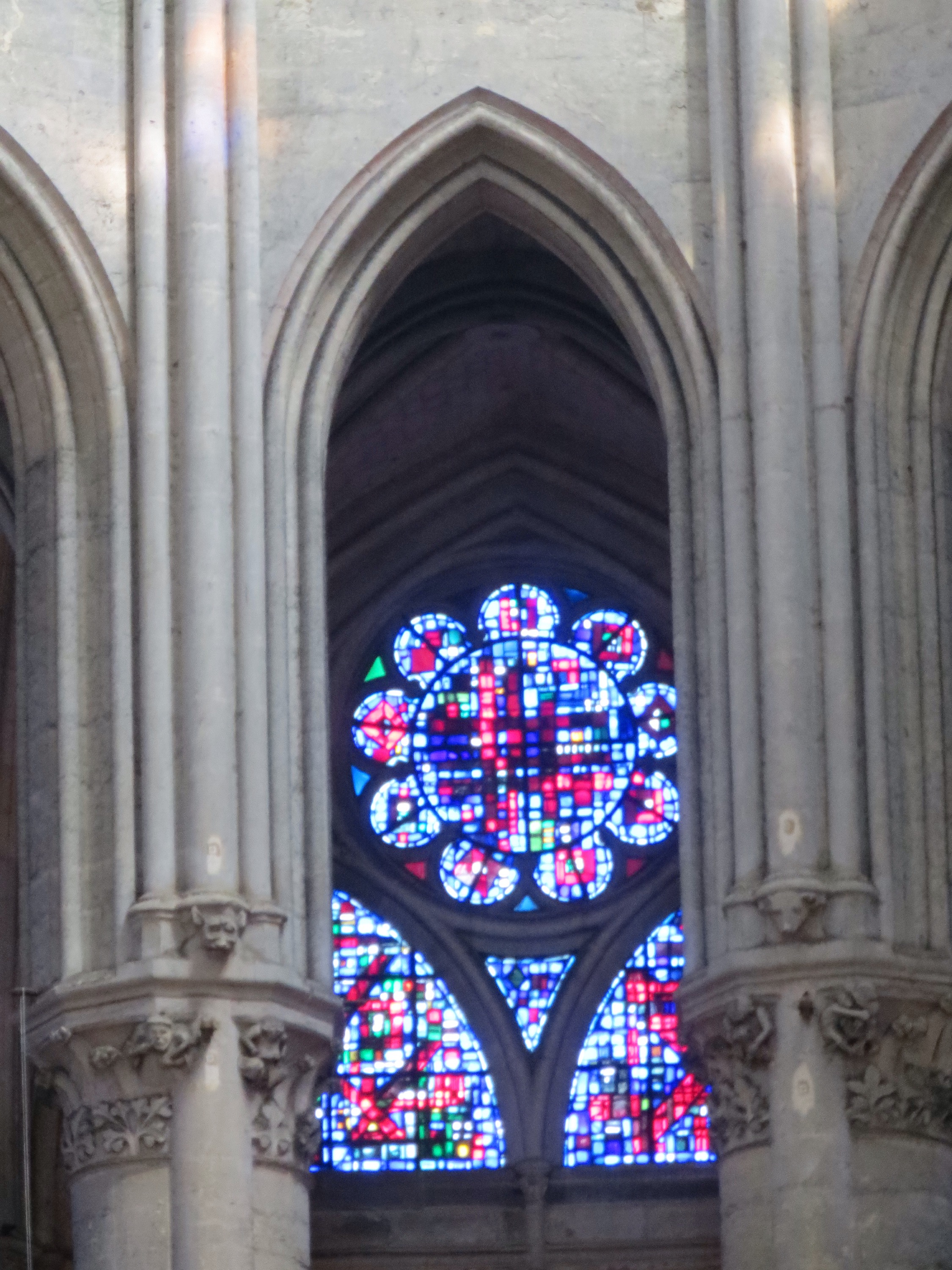 Remember that the building survived the ravishes of the Black Death, the Hundred Years War when Beauvais was besieged by the Duke of Burgundy and the French Revolution. A quick aside is that during the siege by the Burgundian allies of the English, a local woman led the defense of the town parapets. Jeanne Hachette (common people did not use last names until much later) used her hatchet as a weapon to inspire the defenders, thus her non de guerre. There is a statue of her in front of the town hall that we were too tired to find. The building also survived an attempt in the 1500’s to out do St. Peter’s in Rome with a 500 foot spire. It too collapsed but the building survived. There is a wooden ceiling cover for the hole created by the collapsed spire. Statuary was attacked by the san culottes during the Revolution and the building found itself in the middle of both 20th Century world wars. Nazi bombing and fires destroyed most of the old town in 1940 along with some of the cathedral outbuildings. We did find a home built in 1410 that survives today. Remarkably there is much of the original stained glass from the Gothic and Renaissance eras as well as some remarkable contemporary works
