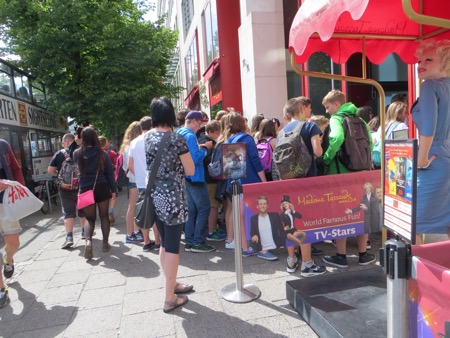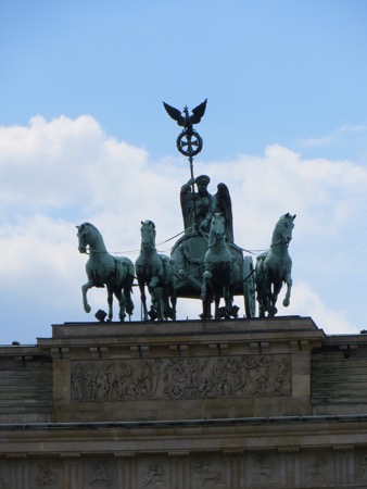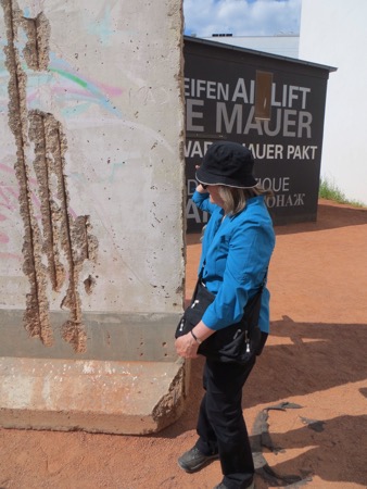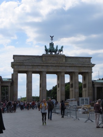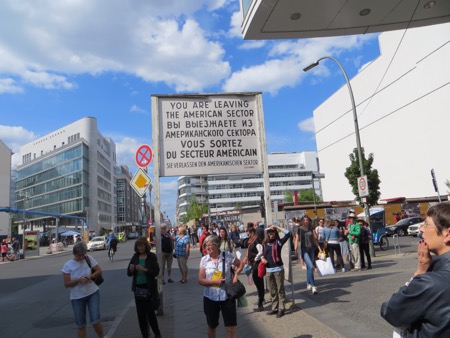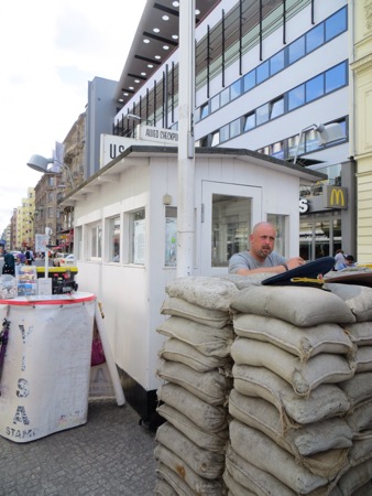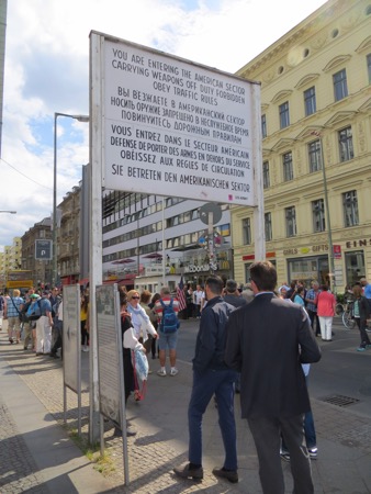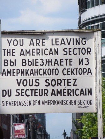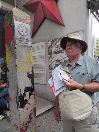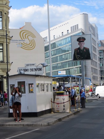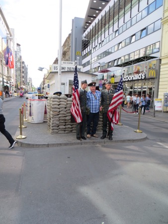The train ride in went well and we walked most of the way to the Brandenburg Gate from the train station. It is still an effective backdrop for American Presidents although the line to get into Madame Toussand’s Wax Museum was much longer. I can’t remember if the horses on top are original or in Paris. Anyway, the sight brings back plenty of memories and speeches. We needed to strike out for Checkpoint Charlie. We probably walked more than we had to but we found it. Actually we found a tourist trap with what I believe is a replica check point festooned with guys wearing American uniforms that offer an opportunity to pose with them. The area is full of souvenirs, tourists and tripe. Peggy was moved more than I was. She couldn’t believe that I had gone through there in 1966. At that time the East German authorities allowed a group of American college students to cross the “border” so that we could see the memorial to the heroic Soviet forces that got rid of Hitler and protected the Germans from Americans.