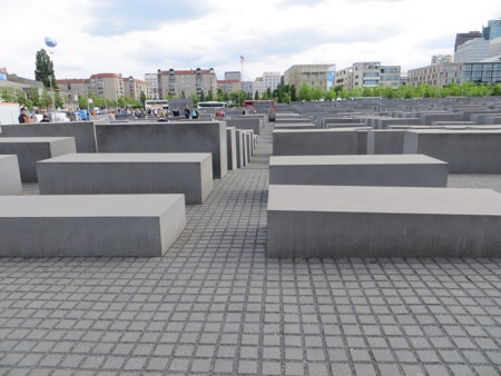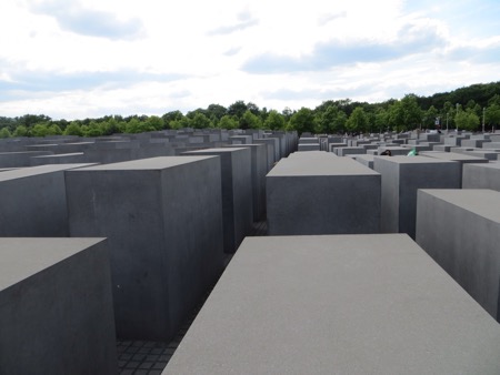 After starting to figure out Berlin mass transit we managed to ride most of the way to the Holocaust memorial near Brandenburg Gate. The rectangular, undulating dark concrete blocks are eerily like a giant graveyard with no distinguishing marks. I was more affected by Auschwitz, but I am glad the Germans built this moving memorial.