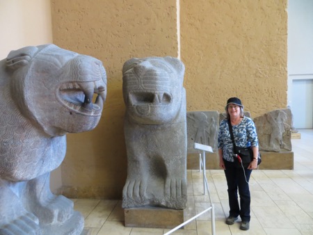 The Diocletian gate from Miletus was amazing and brought back memories of Split. Peggy enjoyed posing with the large cats that reminded her of our own wonderful cat Goldie. The presence of the Stele of Hammurabi was worth the price of admission alone. We then switched museums easily and found ourselves wandering through the massive Egyptian collection. They didn’t find the Ark of the Covenant but they brought pack plenty. Their were several complete tombs with the hieroglyphics that were crisp enough to have been carved yesterday. Of course, we saw Nefertiti in all her glory. No pictures allowed because of the painted plaster. Great collection of hieroglyphs that were translated. I  enjoyed the one complaining about bad wine. I need a copy to post in the cellar.