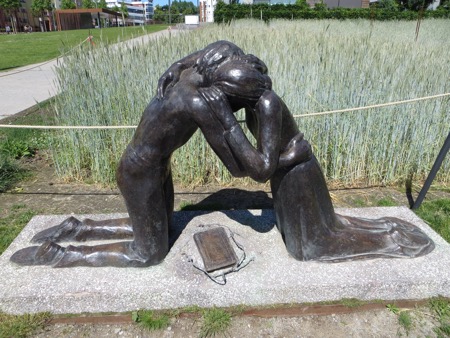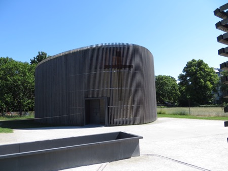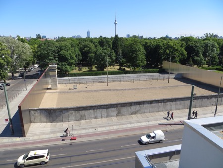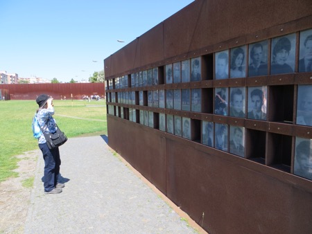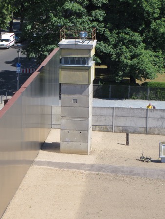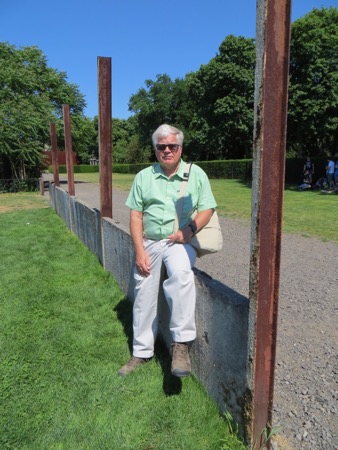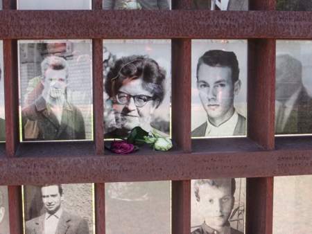 We had lunch with some aggressive sparrows and headed back on the train to the Berlin Wall Memorial. The open air displays feature some of the only real,sections of the wall that was built in 1961 and became a part of our living history. The grassy areas were the dead zones. The East Germans went to tremendous lengths to imprison their citizens. There are pictures of those killed trying to escape as well as brass escutcheons marking successful escapes. This was the real thing and no tacky tourist junk was permitted. There was a church that interfered with fields of fire that was first sealed off and then blown up by the Commies. A small chapel now sits where the old church was built. The twisted cross was hidden by grave diggers from the authorities until after the fall of the Communists.