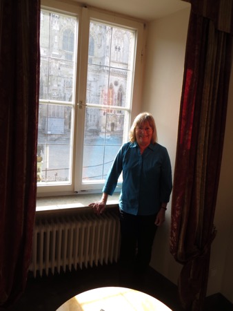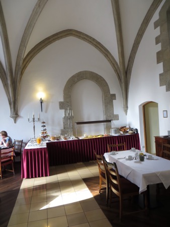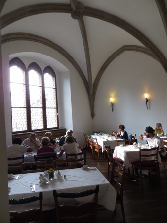 A few notes on yesterday are needed. We found the riverfront restaurant that serves only wurst and sauerkraut. Did not see any Hobbits. We did manage to upload a blog from a “student coffee house/beer hall” that play atonal music. The beer was good. We awoke this morning to breakfast in the Gothic arched dining room. I spent the meal trying to figure out how they built it.